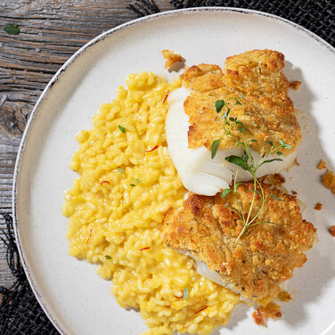 Kabeljau unter Bergkäsekruste mit Safranrisotto